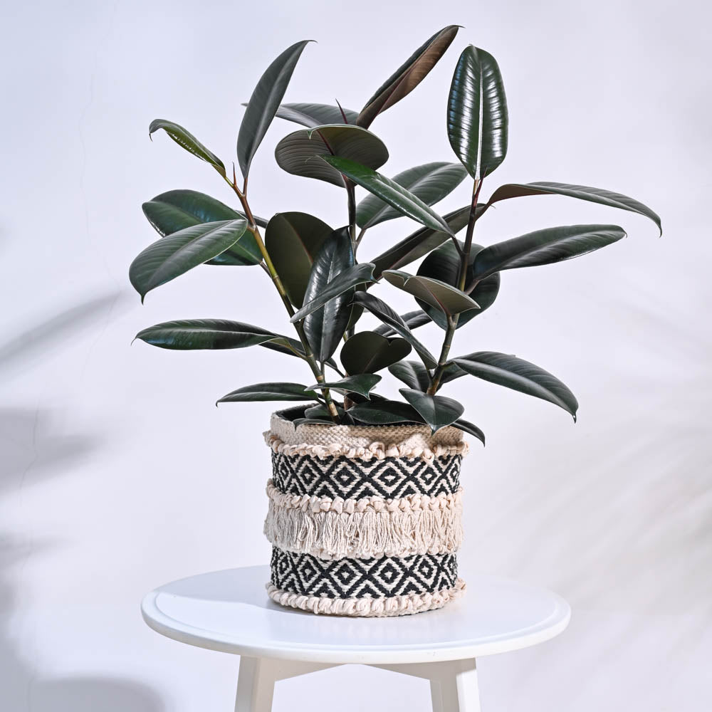 Introducing our handmade cloth planters, crafted with natural jute and cotton fibres in a white and black woven aztec pattern with playful tassels for a bohemian vibe. The planter works as a beautiful outer cover for all kinds of planters so you no longer have to worry about the functional plastic planters not fitting your decor scheme. The organic look goes well with all plants and fits seamlessly into any home. It is completely washable and can be folded and stored when not in use. It also doubles up as a catch all for your small knick knacks.