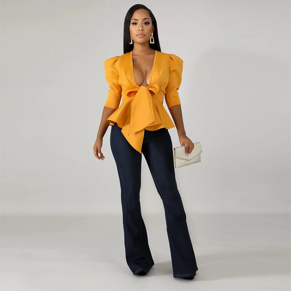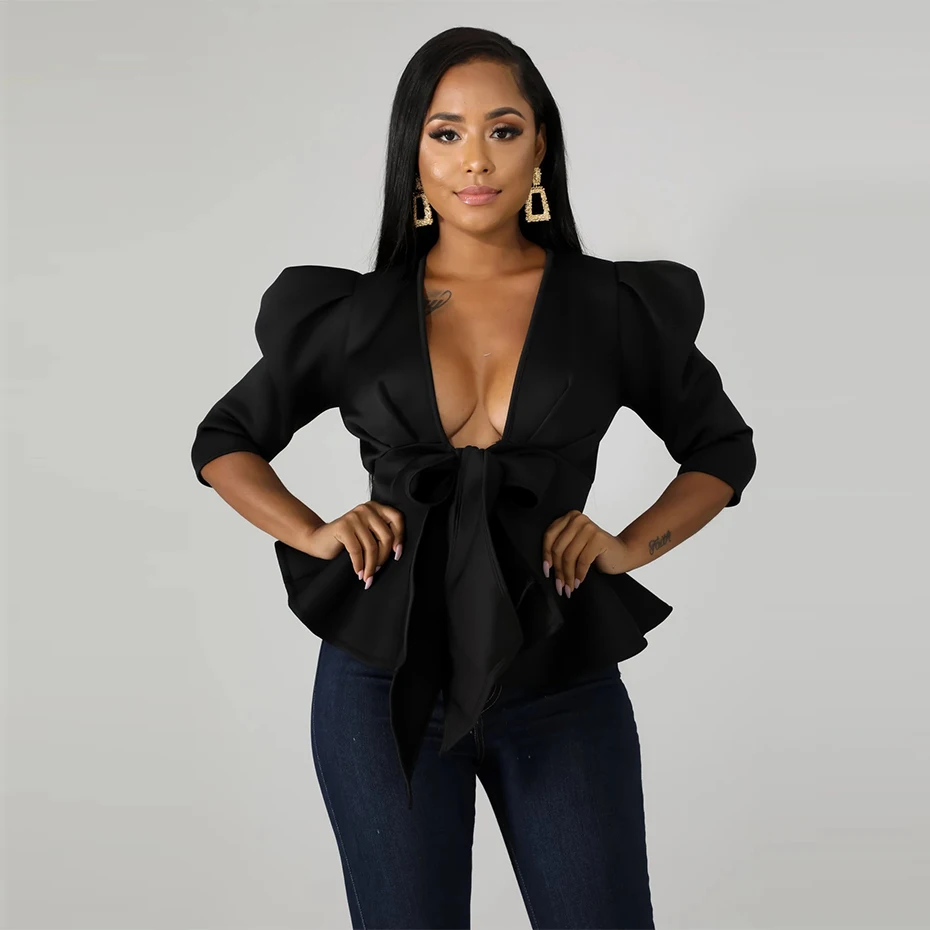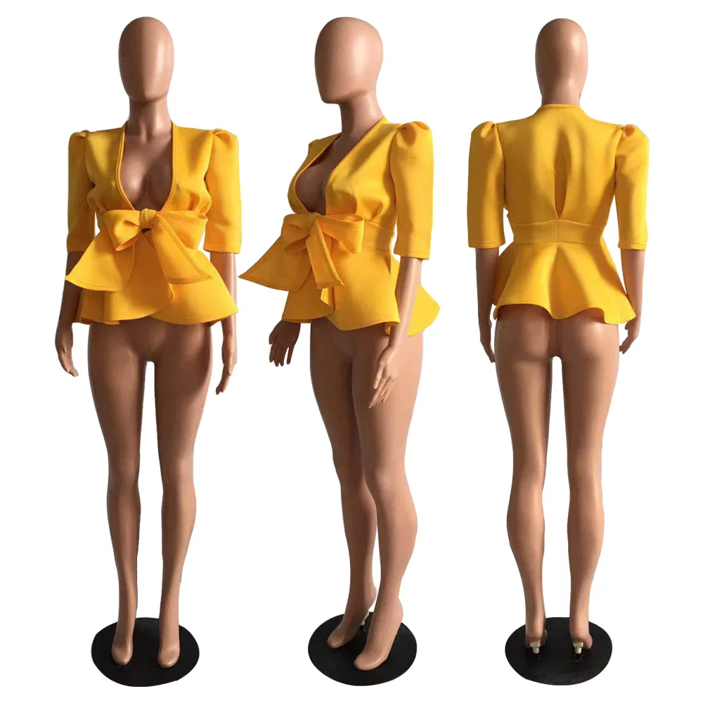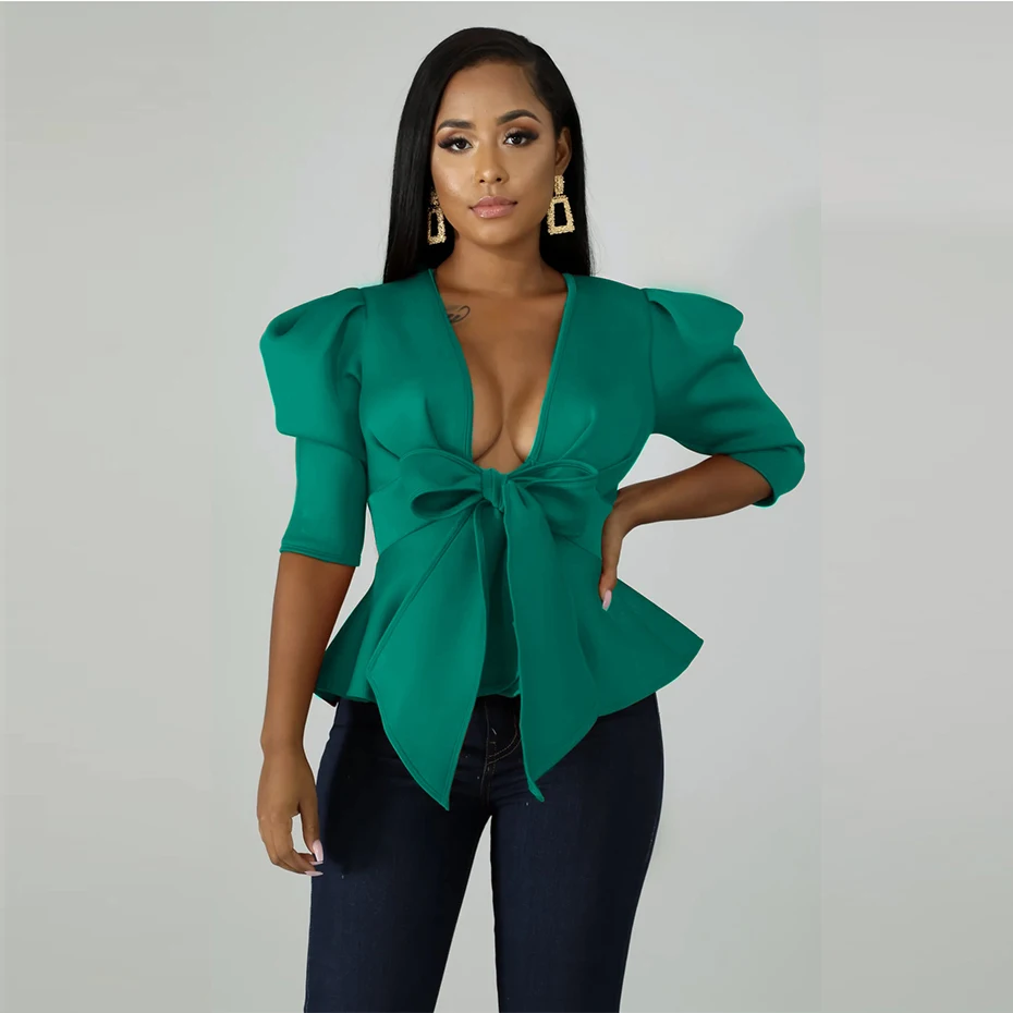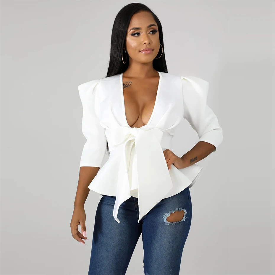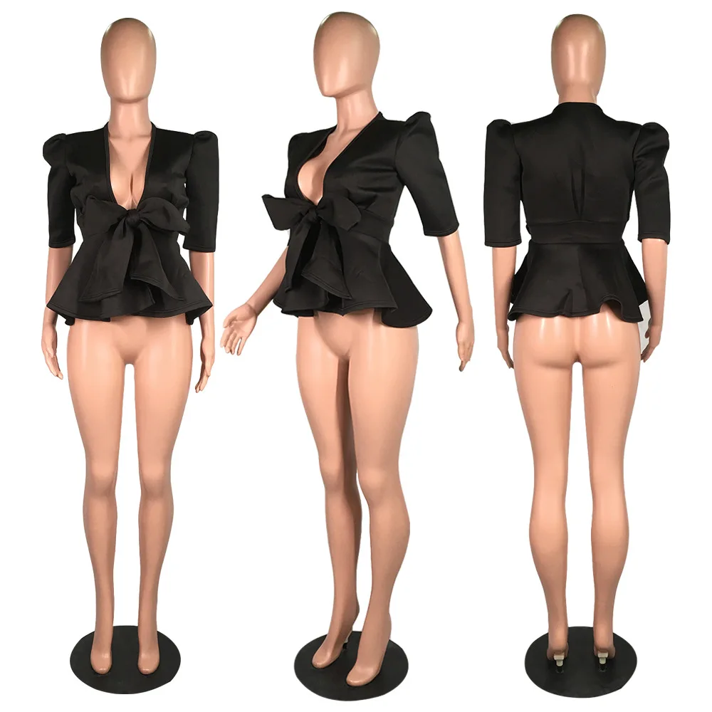 HAOYUAN Plus Size Womens Tops and Blouses 2019 Autumn Sexy Clothes V Neck Tie Up Tunic Half Sleeve Blusas Fashion Ruffle Blouse