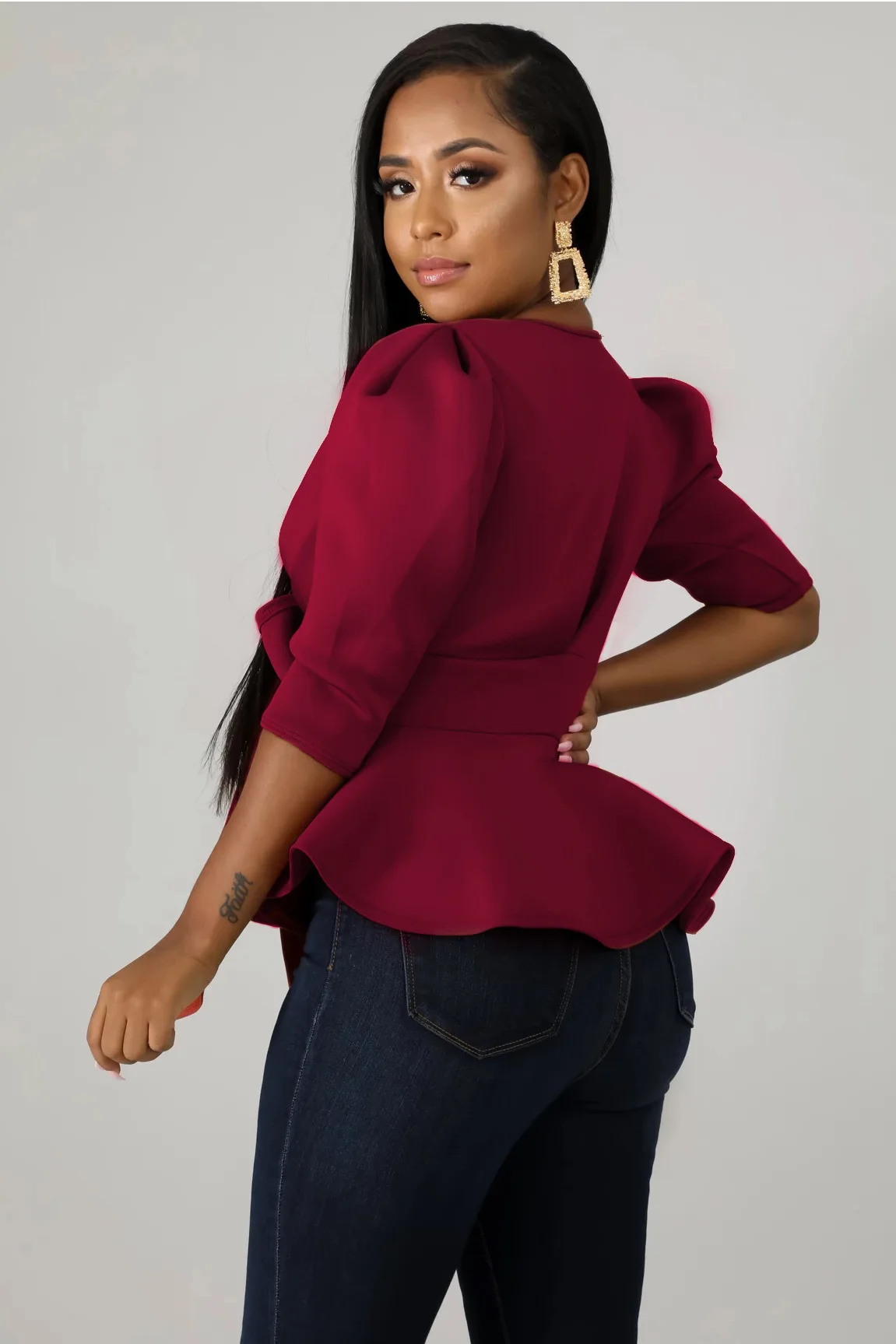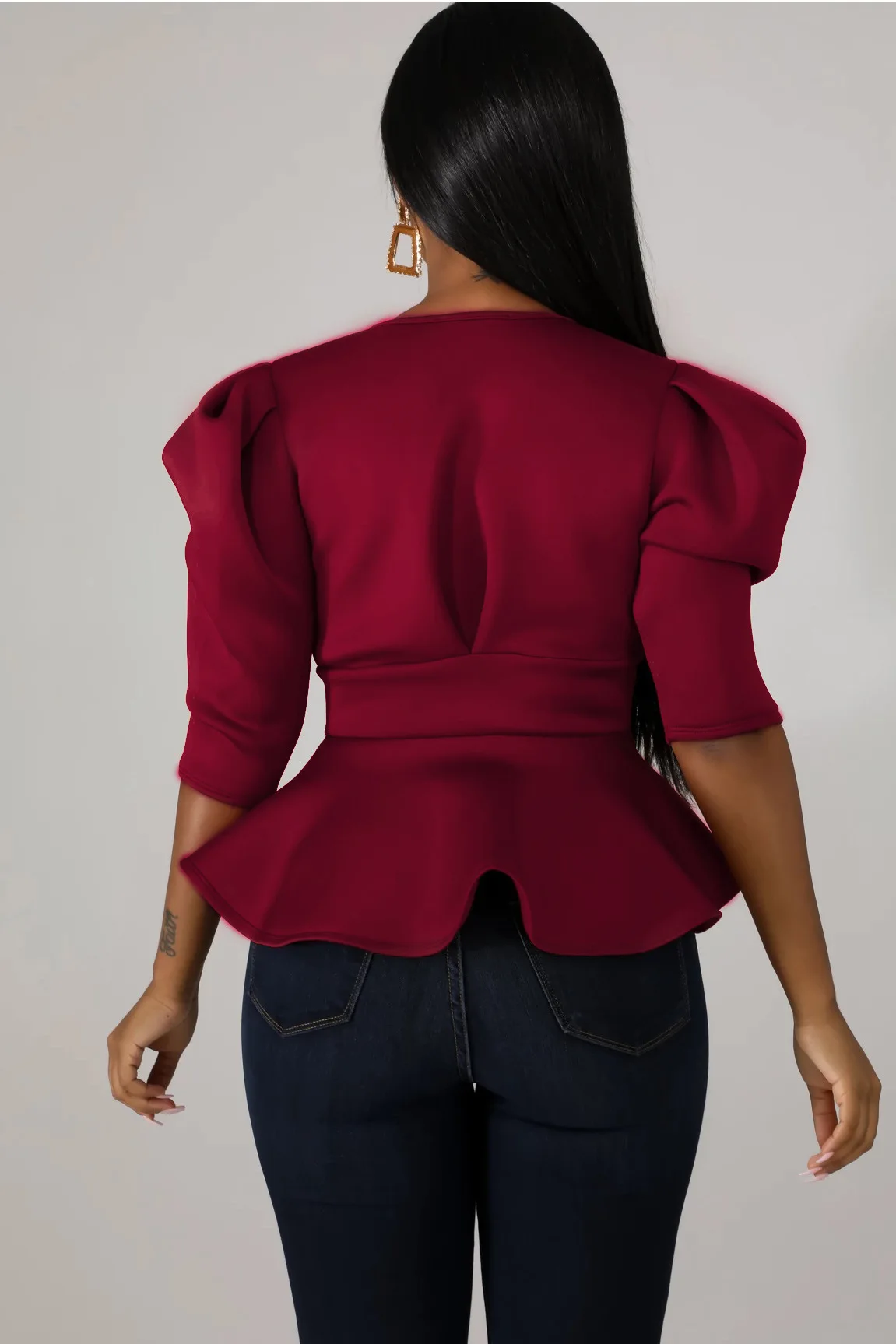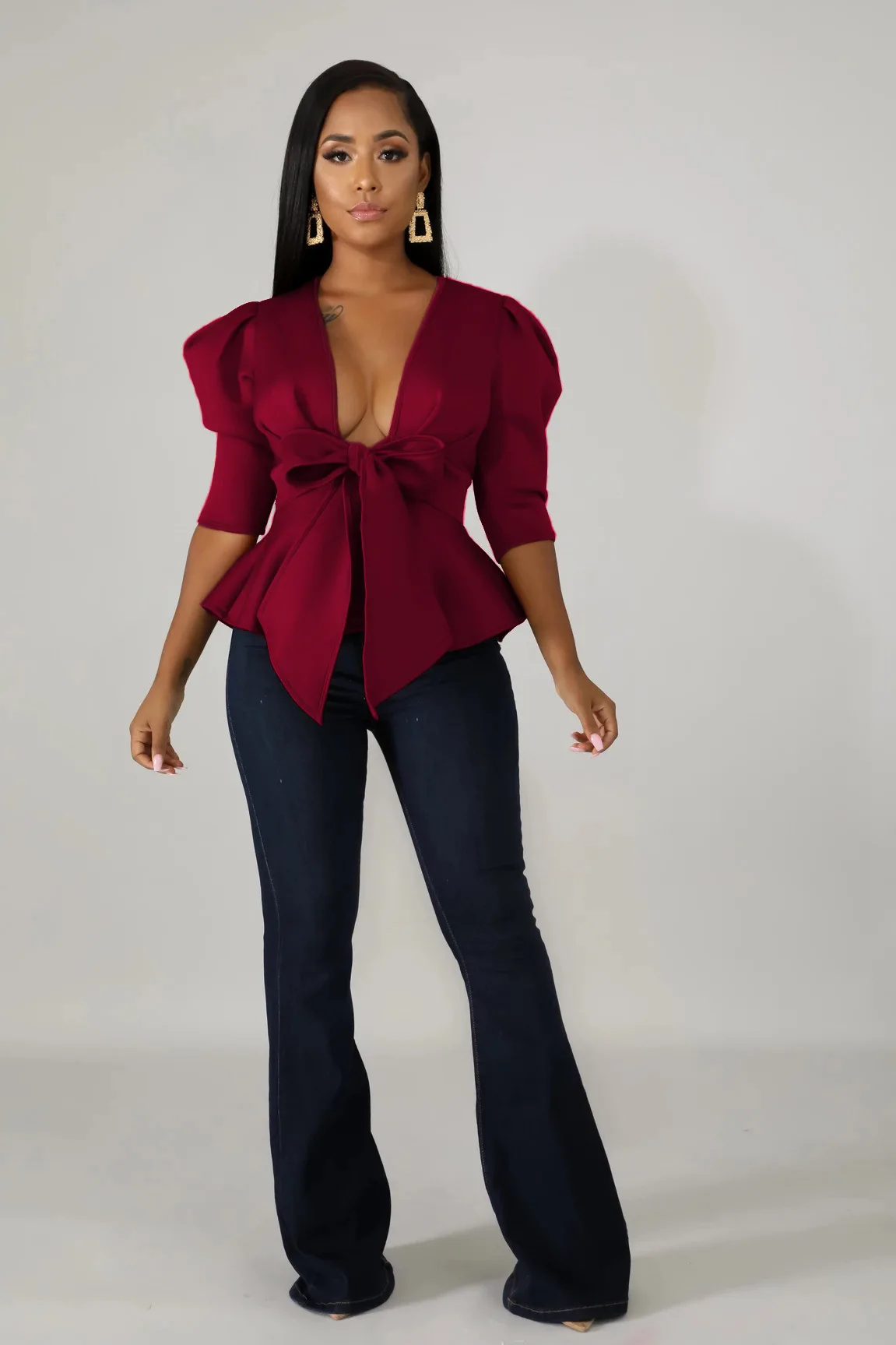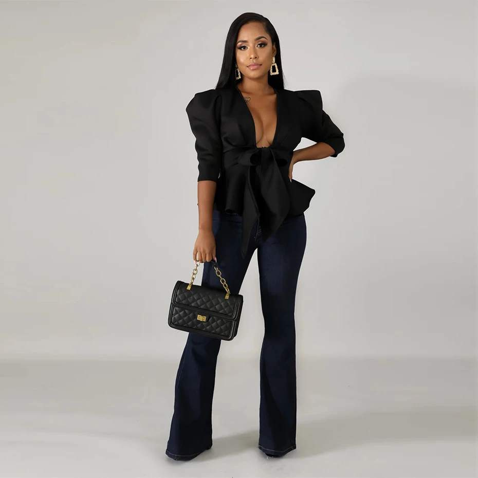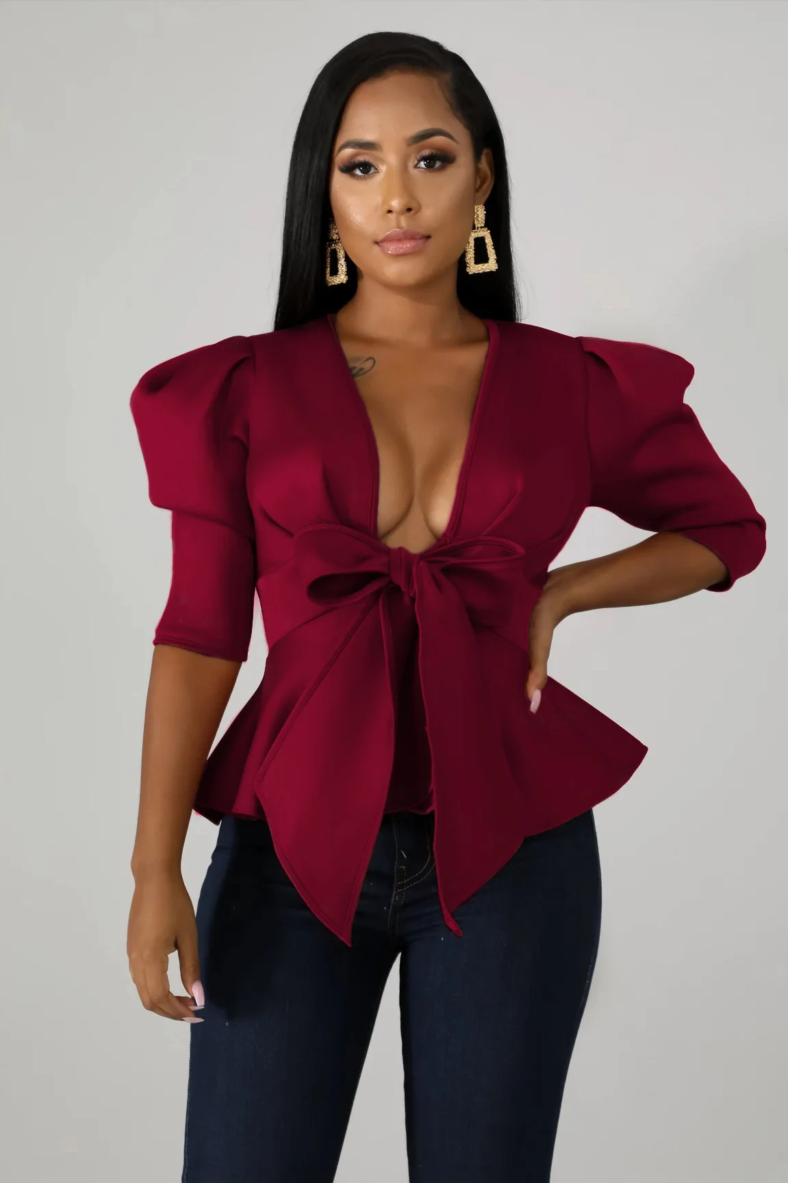 HAOYUAN Plus Size Womens Tops and Blouses 2019 Autumn Sexy Clothes V Neck Tie Up Tunic Half Sleeve Blusas Fashion Ruffle Blouse
