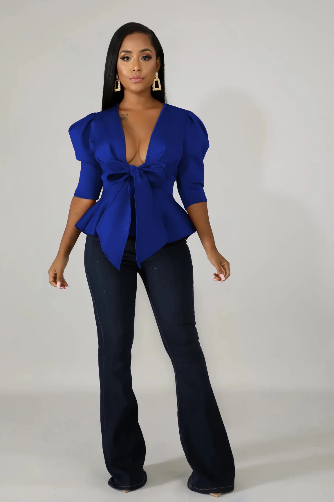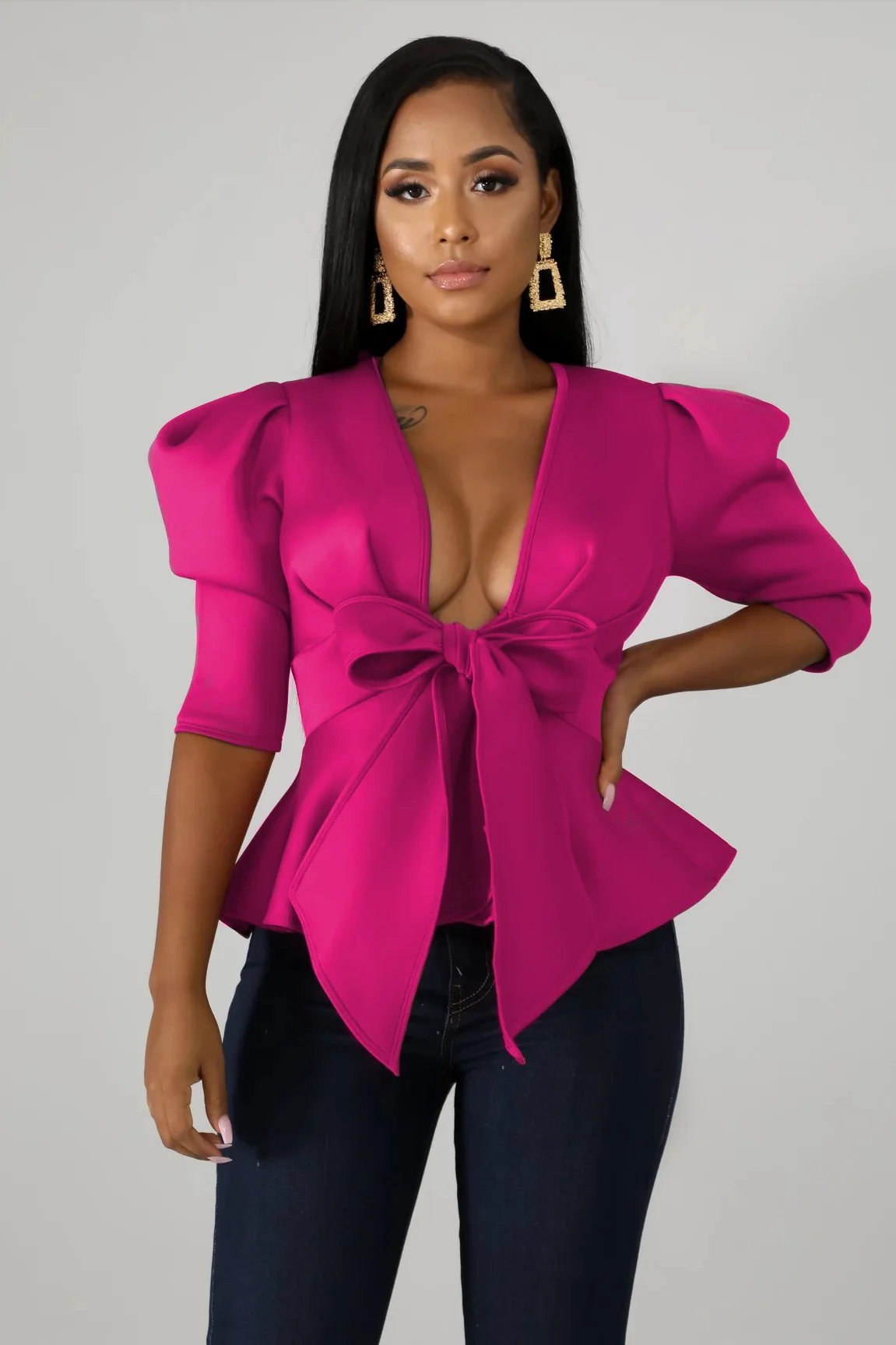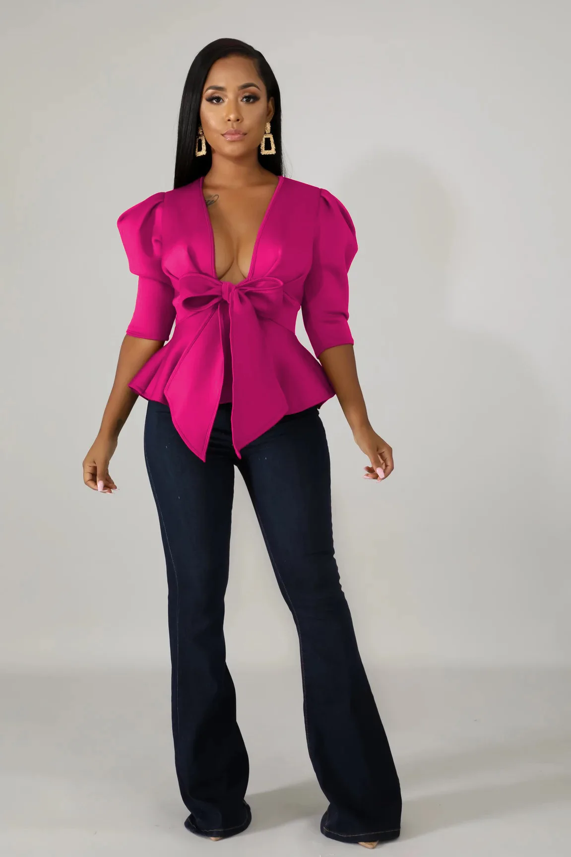 Modern Blouse V Neck Half Sleeve Ruffle Front Bow Style