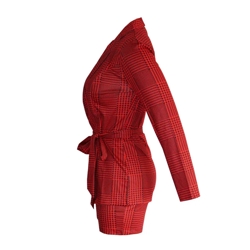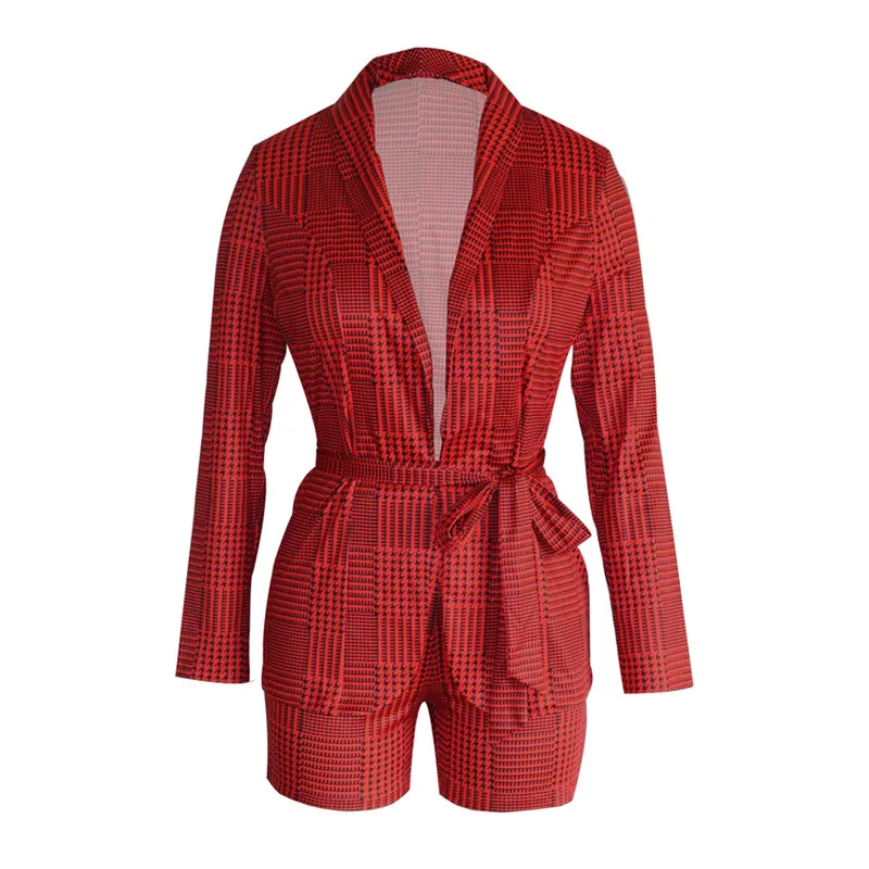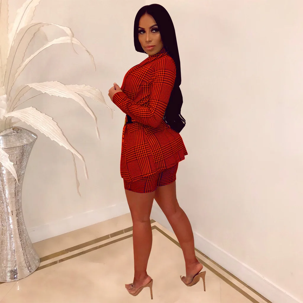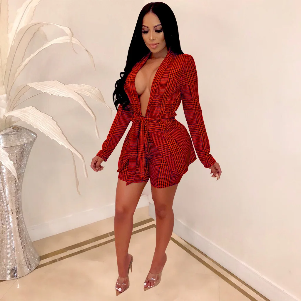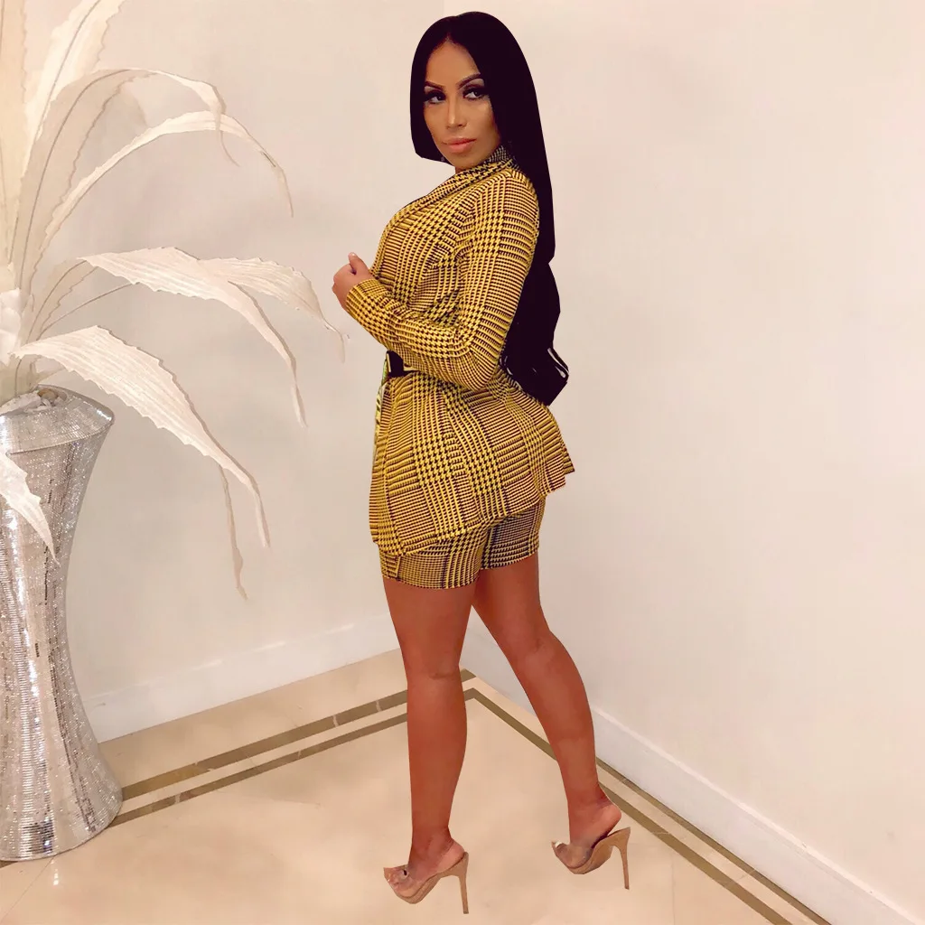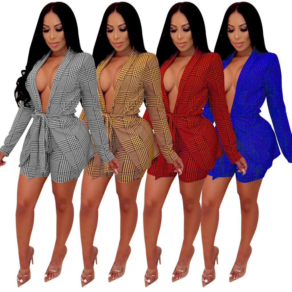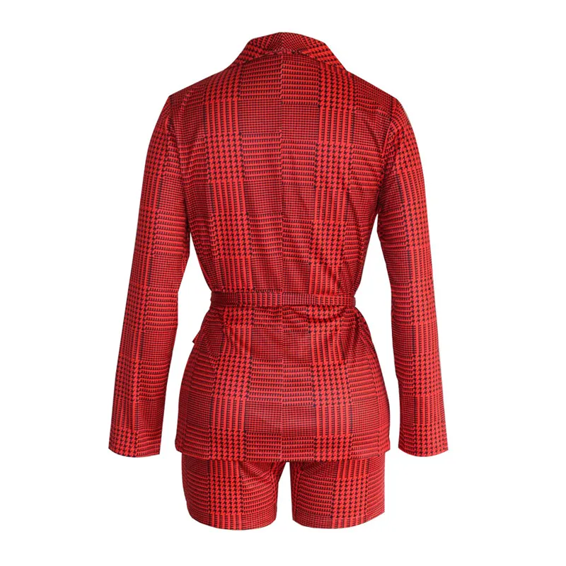 Plaid Print Set Deep V Neck Blazer Top & Knee High Short